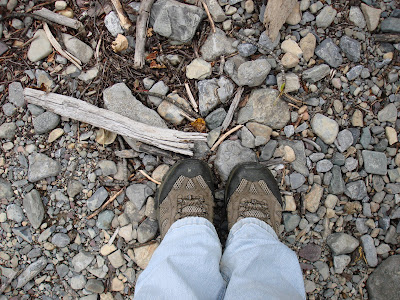 A quick stop at the Logan Creek Drainage, a cozy cabin in the woods ( probably for the Rangers ) and the tops of the mountains hidden in the clouds today. What is striking in how much loose rock is in this creek bed. It makes you wonder what goes on at the height of spring melt.